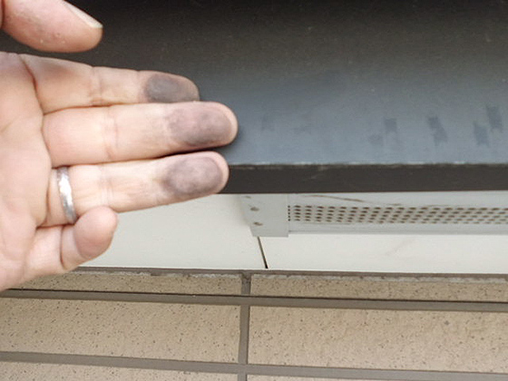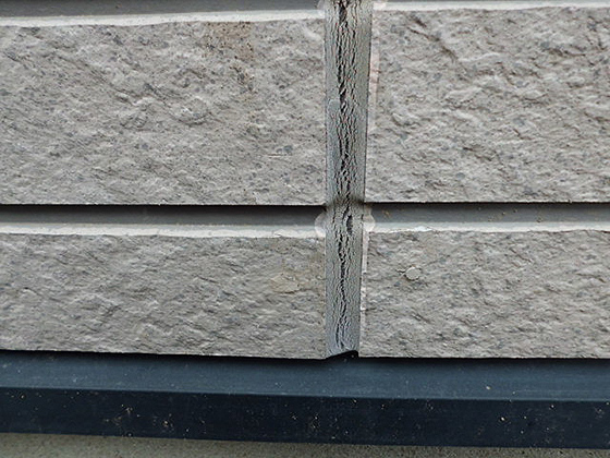 この事例では現地調査・点検の写真が多数あります。外壁は窯業系サイディングですが、亀裂・コーキングの劣化が認められました。また新築時のものと思われる塗料の垂れがありました。