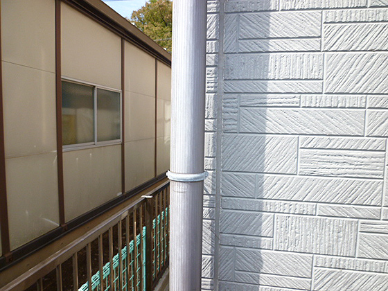 増築部分のある事例です。外壁、屋根ともちぐはぐな感じです。外壁のイメージ色、雨樋既存部分との色合わせを、現場にて調色しました。当社調色技術で、違和感のない外観に仕上がりました。