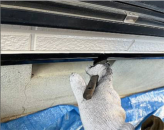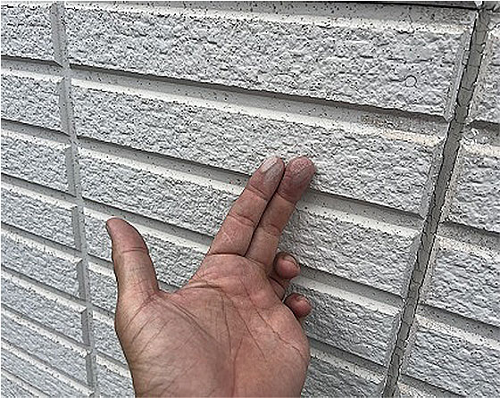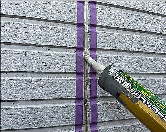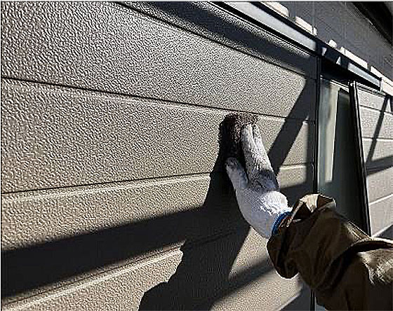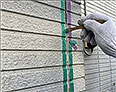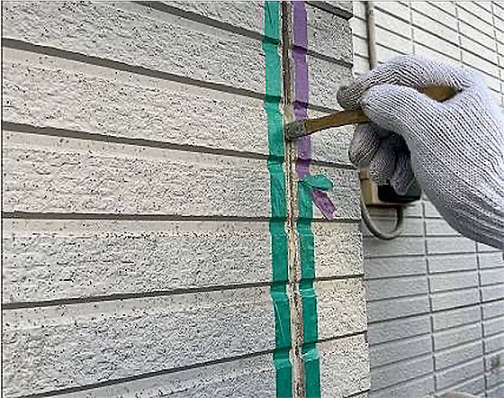 外壁サイディングの施工事例です。外壁には経年劣化による退色、チョーキング現象が視られました。コーキングにも経年劣化による亀裂 痩せが視られました。撤去~新規打ち直し作業を予定しております。
