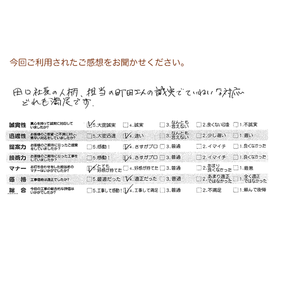 下に掲載した直筆アンケートで、お客様が手前どもの言いたいことを代弁してくださっています。なかでも、社員の人柄に好感が持てるとのお声が多いのは、いちばん嬉しいことです。